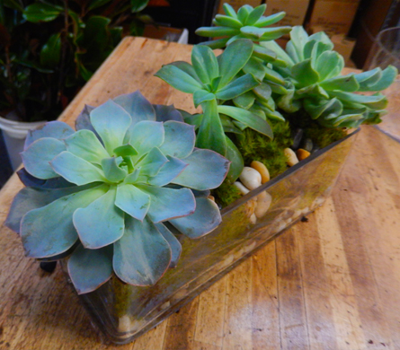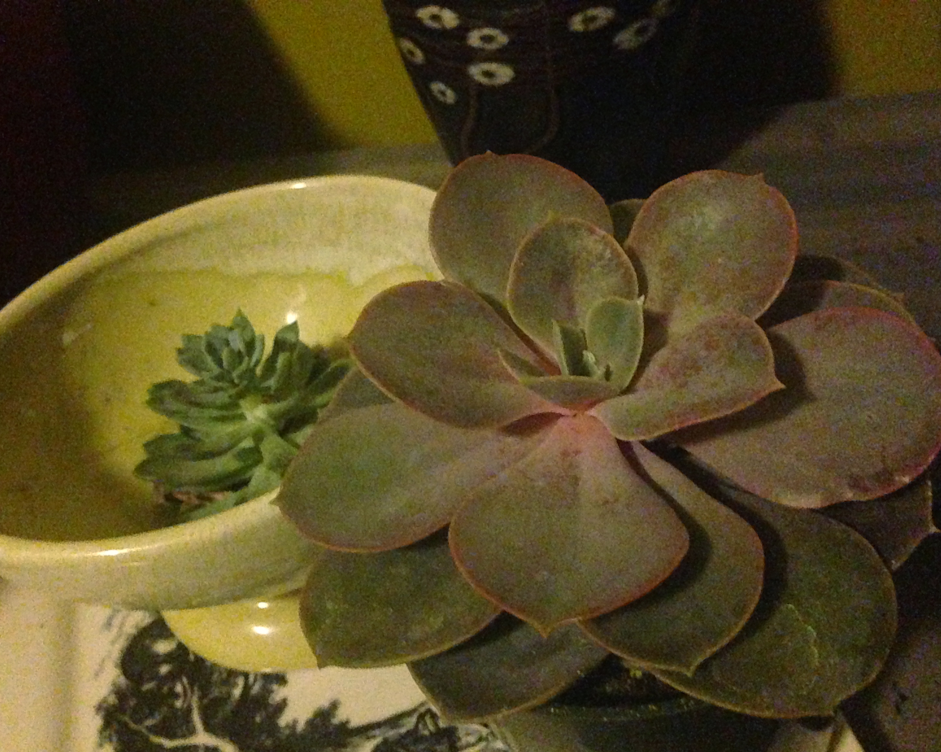 Today’s succulent bounty in the front, the first-day succulent is in the yellow planter