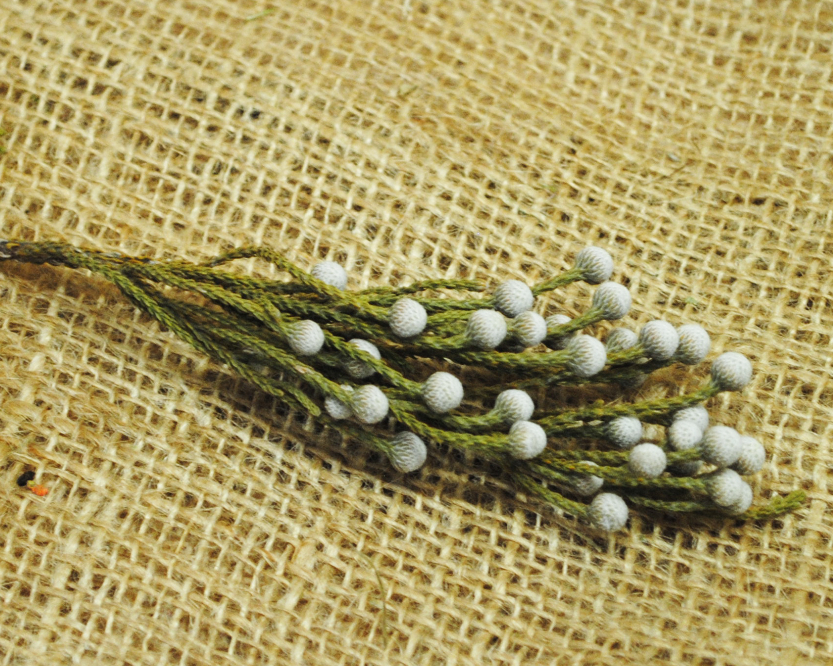 As it is used in floral arranging, the petals of the Brunia flower have already fallen away to reveal a natural silvery cast that somehow seems both quirky and chic.